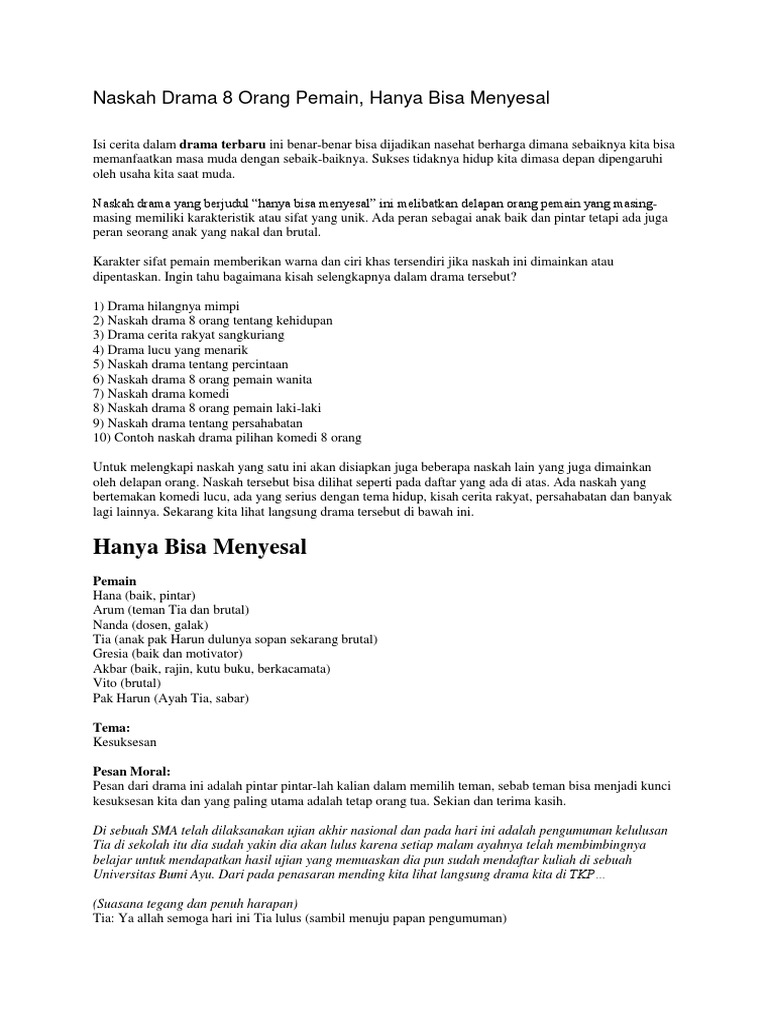 Teater Persahabatan Lucu Komedi 3 5 6 7 8 9 Orang Untuk pembahasan kali ini kami akan mengulas mengenai Naskah Drama yang. Contoh Naskah Drama Musikal 8 Orang - Naskah drama yang berjudul hanya bisa menyesal ini melibatkan delapan orang pemain yang masing masing memiliki karakteristik. 14 Contoh Naskah Drama.