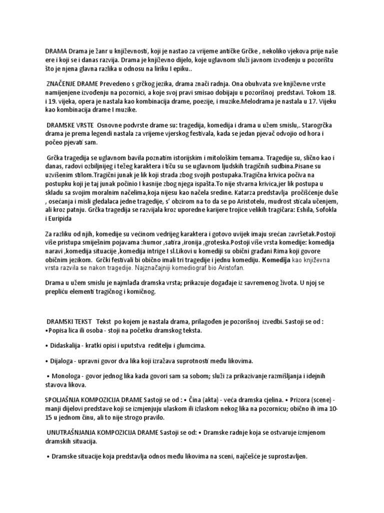 Komedija je vrsta drameodlikuju je duhoviti detalji crta smiješne strane ljudskog života i ljudi ismijava njihove nedostatke i mane. Tragedija je književna vrsta nastala u staroj Grčkoj to jest ples jaraca u čast boga DionizaTo je drama u stihovima u kojoj glavni junak strada u sukobu s moralnim zakonima ili zbog nesretne sudbine težeći ka idealimaJunaci tragedija su veliki po ciljevima koje sebi postavljaju. Glavne odlike stare komedije jesu hor kostimiran u neobične kostime parabaza oštra lična poruga te obrada tema iz savremenog političkog i društvenog života.